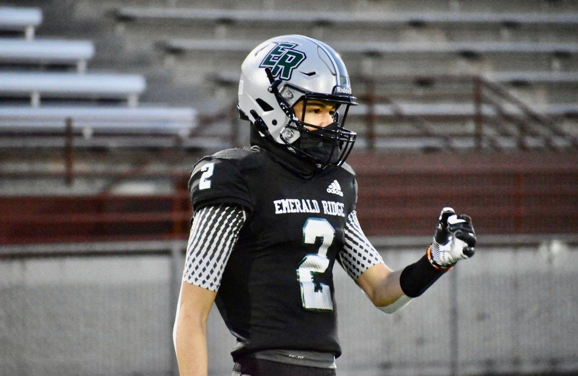 Quote from former Emerald Ridge coach Adam Schakel: “He used to say, ‘Football is my thing, and I love football, and I want to play as long as I can!’ … He checks a lot of boxes in what he can do catching the football.”